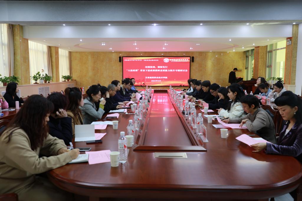 正值习近平总书记在学校思想政治理论课教师座谈会上发表重要讲话五周年,为深入贯彻落实“3·18”重要讲话精神,提升“大思政课”建设教师专业能力素质,努力造就新时代高素质教师队伍,提高教育教学质量,加强思政课名师工作室建设与交流,3月21日下午,马克思主义学院组织开展了《培根铸魂,强师先行——甘肃建筑职业技术学院“大思政课”建设教师素质能力提升专题研讨会》。全国思想政治理论课名师工作室主持人、全国思政课“教学能手”、甘肃省大中小学思政课一体化建设委员会委员、兰州理工大学马克思主义学院院长饶旭鹏教授、兰州工业学院、甘肃财贸职业学院、甘肃交通职业技术学院、兰州职业技术学院、兰州市第八十三中学、兰州市七里河区晏家坪第二小学专家、领导和教师代表以及甘肃建筑职业技术学院党委书记、院长王娟丽,宣传部、教师发展中心、办公室、马院负责人和思政课教师参加了此次研讨会。参会名师工作室有:全国思政课名师工作室饶旭鹏名师工作室、甘肃省思政课名师工作室王瑛、杨海晖、刘霞名师工作室。马克思主义学院院长王瑛主持研讨会。