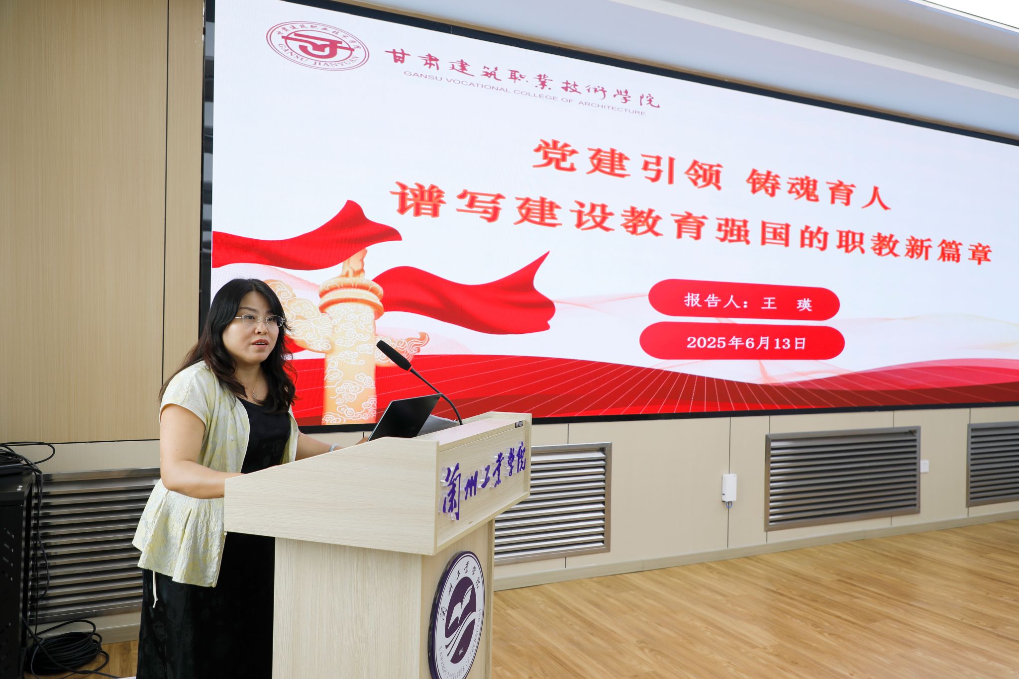我校马克思主义学院院长王瑛以《党建引领 铸魂育人 谱写建设教育强国的职教新篇章》为题作主旨报告,从职业教育发展概述,立德树人、德技并修,谱写建设教育强国的职教新篇章三个方面展开,深入阐述了如何将习近平新时代中国特色社会主义思想融入职业教育,如何通过党建引领实现思政教育与专业教育的有机融合,为培养德智体美劳全面发展的社会主义建设者和接班人提供了新思路、新方法。