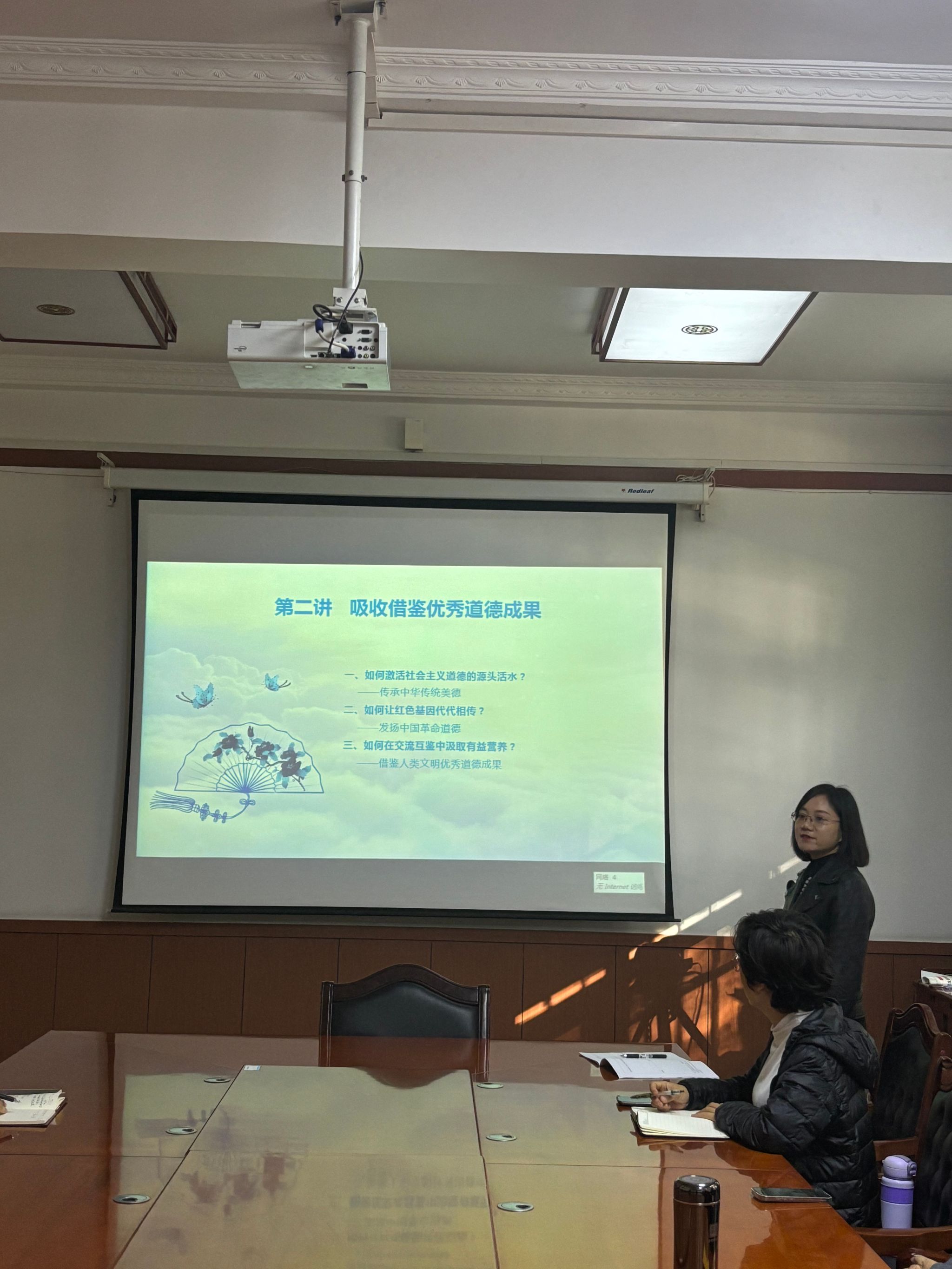 会上,杨玉荣老师和郭燕花老师选取了《思想道德与法治》课程的内容,进行了教学内容和方法的交流分享。两位老师讲解逻辑清晰,条理分明,让在场的老师们对本门课程有了更加清晰的认识。